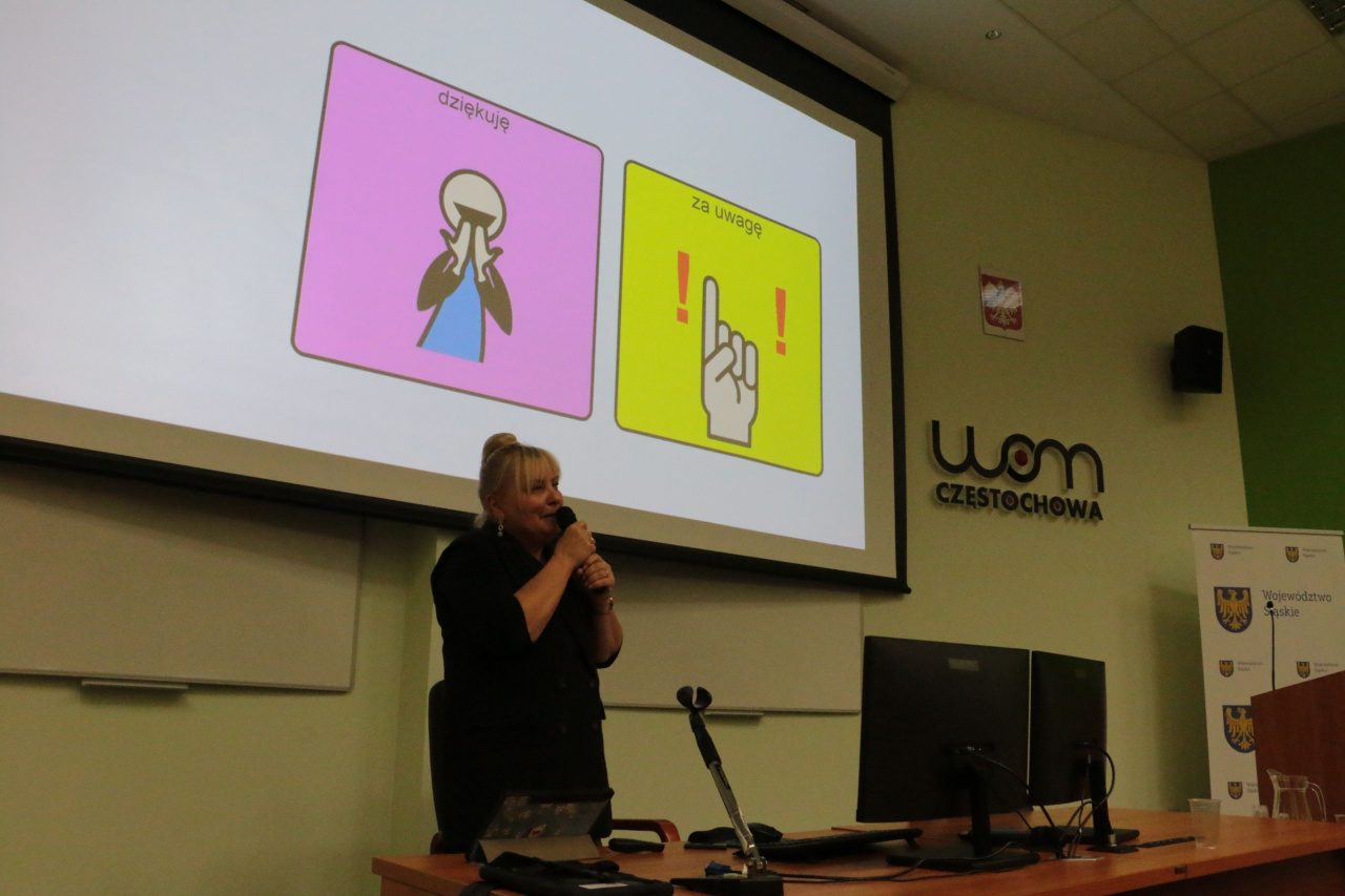 Druga część konferencji poświęcona była na prezentację konkretnych rozwiązań wprowadzanych w szkołach. Anna Kuśmierska, wykładowca akademicki Uniwersytetu Jana Długosza w Częstochowie, pedagog specjalny, przedstawiciel firmy MÓWIK, przeprowadziła wykład „Komunikacja to proces –praktyczne rozwiązania i codzienna praca z uczniami ze złożonymi potrzebami komunikacyjnymi w Zespole Szkół Specjalnych nr 45 w Częstochowie”.