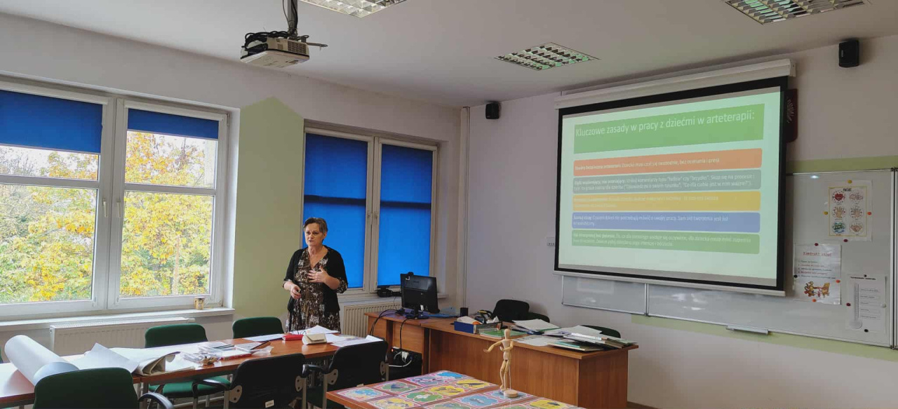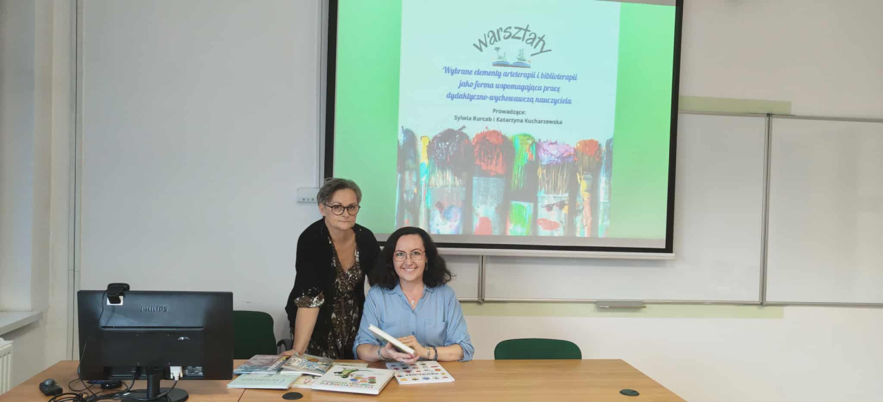 Sylwia Kurcab nauczyciel-konsultant i Katarzyna Kucharzewska nauczyciel bibliotekarz przeprowadziły dwa szkolenia dla nauczycieli Wybrane elementy arteterapii i biblioterapii jako forma wspomagająca pracę dydaktyczno-wychowawczą nauczyciela. 3 października 2025 r. odbyło się webinarium, natomiast 6 października 2025 r. warsztaty stacjonarne.