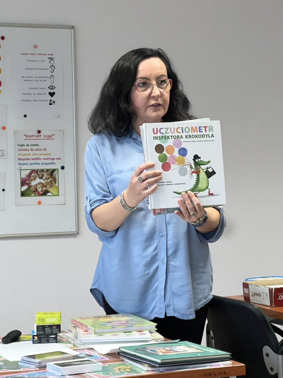 Z kolei Katarzyna Kucharzewska przedstawiła metodę biblioterapii jako metodę pracy z uczniem przy wykorzystaniu książki, opowiadania, bajki terapeutycznej czy innego materiału czytelniczego. Zaprezentowała przydatne narzędzia, metody i techniki biblioterapeutyczne oraz literaturę terapeutyczną dotyczącą poczucia własnej wartości, emocji, praw dziecka, wartości życiowych i odporności psychicznej. Grupa poznała także jak pracować z tekstem biblioterapeutycznym na zajęciach.